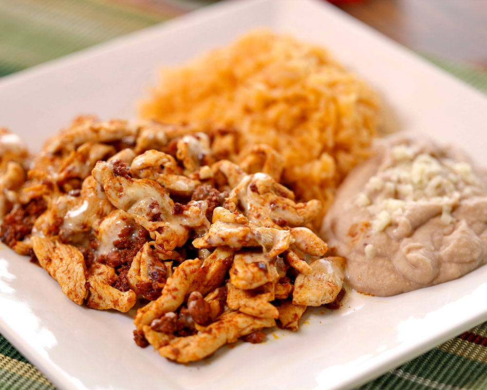 Grilled chicken covered in a blend of sour cream and cheese sauce. Served with Spanish rice, refried beans and tortillas.