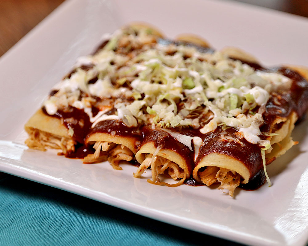 ENCHILADAS RANCHERAS (Spicy) OR ENCHILADAS POBLANAS 13.99 Four enchiladas filled with marinated chicken, covered in your choice of mole poblano or mole ranchero sauce, lettuce, shredded cheese and sour cream.