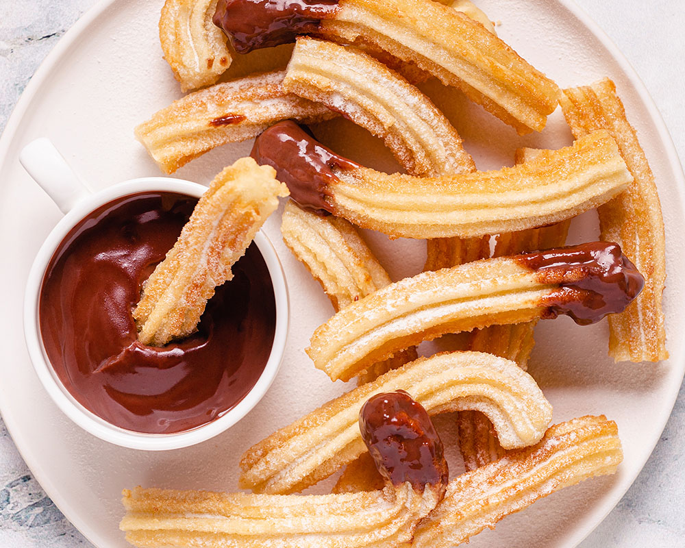 A traditional Mexican pastry, crusted in cinnamon & sugar. Topped with chocolate, whip cream and a maraschino cherry.