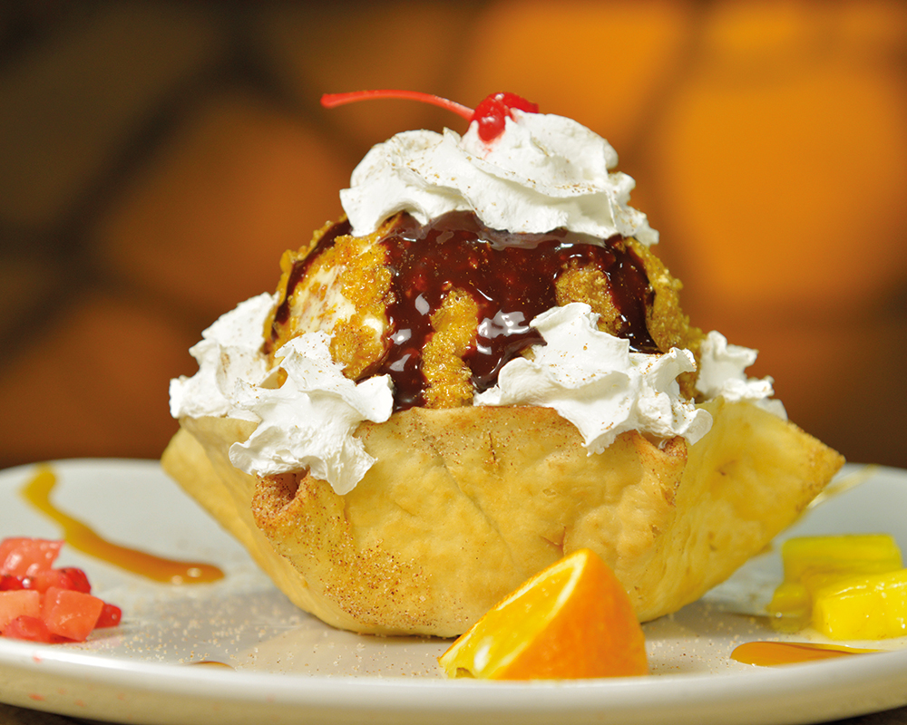 FRIED ICE CREAM 6.00 A vanilla ice cream ball coated in frosted flakes and then lightly fried. Served inside a crispy flour tortilla bowl, topped with honey, chocolate, whip cream and a maraschino cherry.