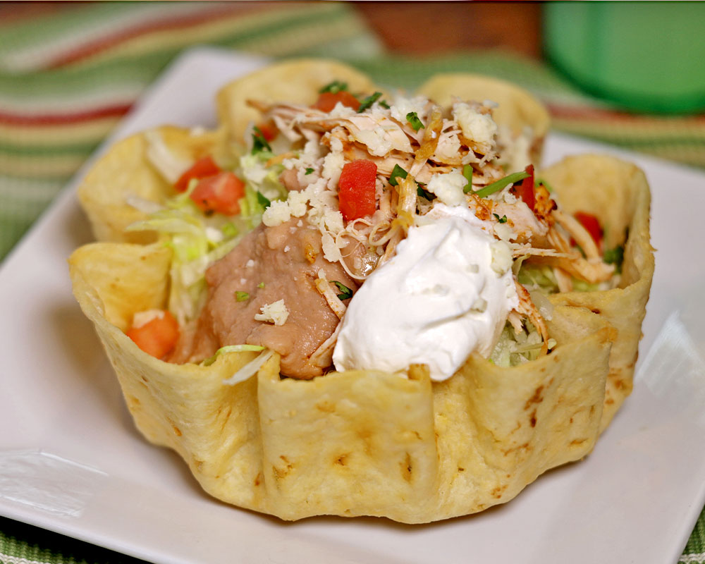 TACO SALAD 11.50 A crispy flour tortilla bowl filled with refried beans, your choice of Marinated chicken or ground beef. Topped with cheese sauce, lettuce, pico de gallo, shredded cheese and sour cream.