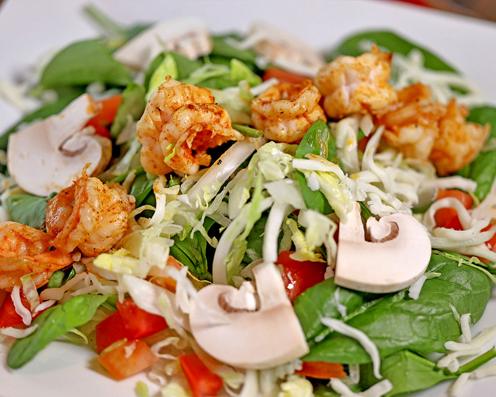 GRILLED SHRIMP SALAD 13.99 Crisp Spinach, lettuce, freshly sliced mushrooms, raw onions and tomatoes. Topped with grilled shrimp, shredded cheese and sour cream.
